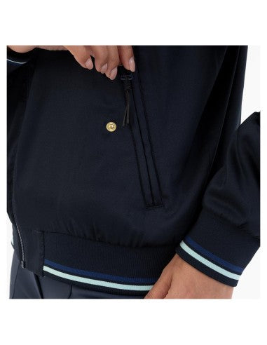 - Metallic front zipper and zipper pockets covered with flap in plain shell fabric