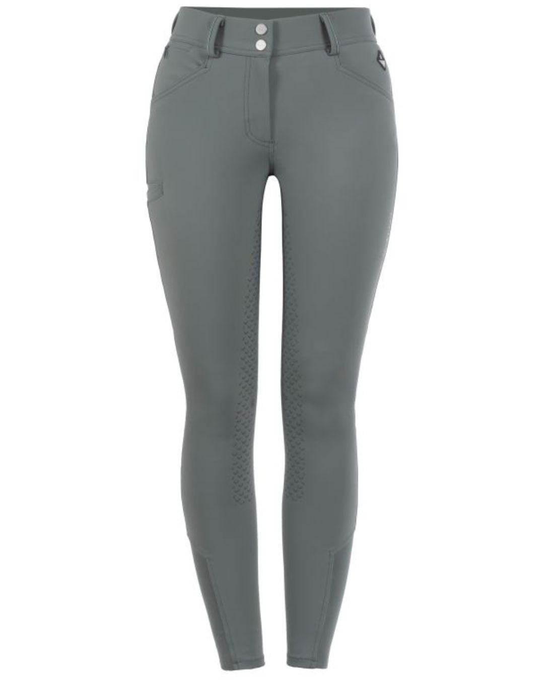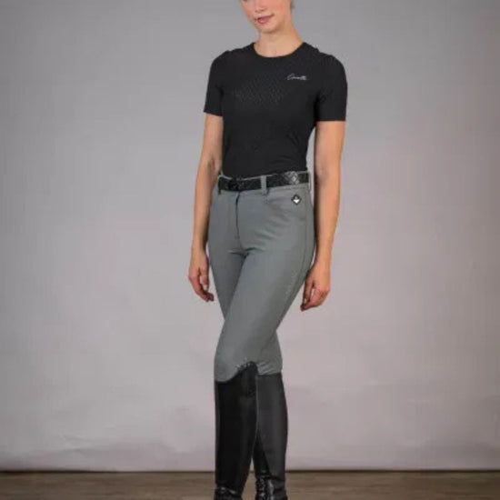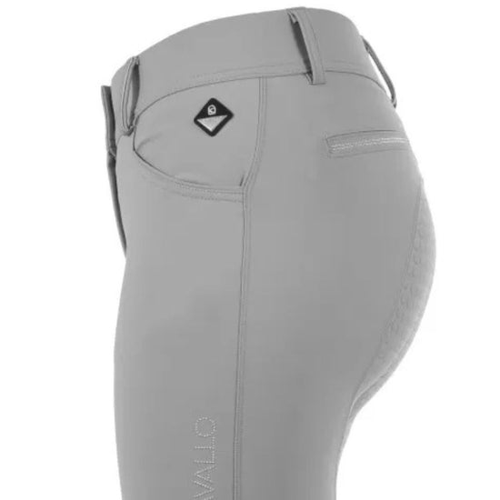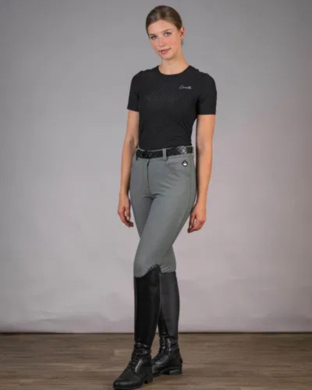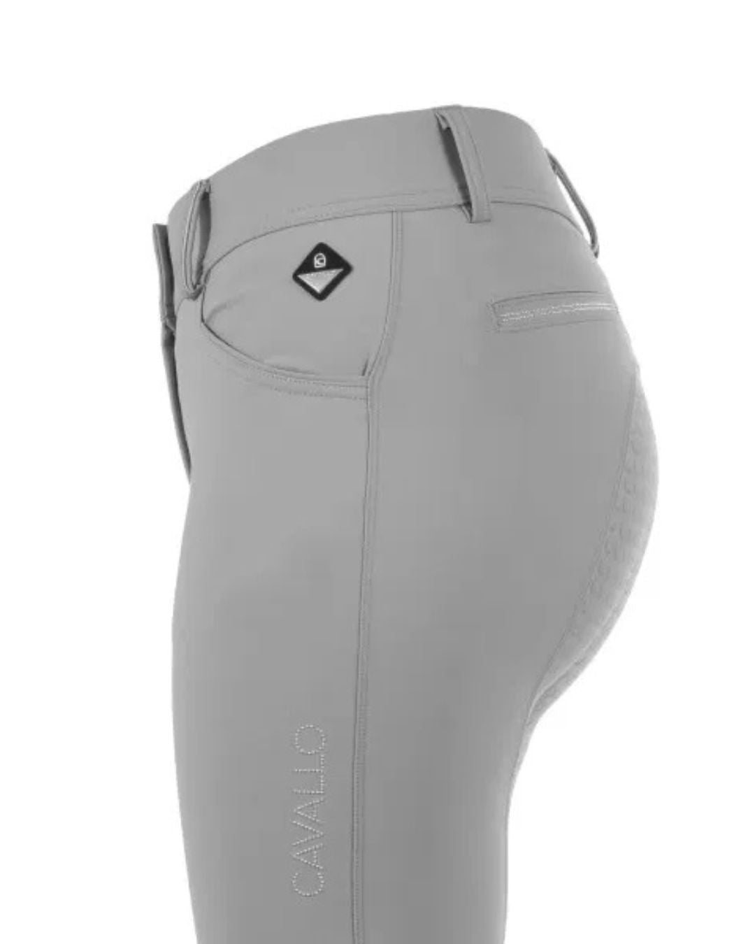 These elegant breeches are crafted from a comfortable outer fabric and feature refined tonal pipings on the belt loops. Stylish imitation welt pockets adorned with sparkling silver-look nailheads add a touch of glamour, while a small coin pocket sits neatly below the waistband on the right. A practical mobile phone pocket on the right thigh combines function with fashion, complemented by high-quality silver-look nailhead artwork on the left thigh and a premium Cavallo patch above the left pocket.