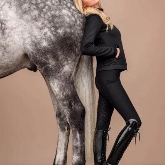 These sporty, warm riding tights are designed for both style and comfort. They feature a wide, ergonomic waistband with a high-waist fit, and are made from soft, brushed fabric on the inside for an exceptionally cozy feel. Elegant Cavallo details in a subtle caviar look add a refined touch, while side cell phone pockets are seamlessly integrated into the flattering design. A silicone trim with Cavallo lettering completes the look, offering both grip and signature style.