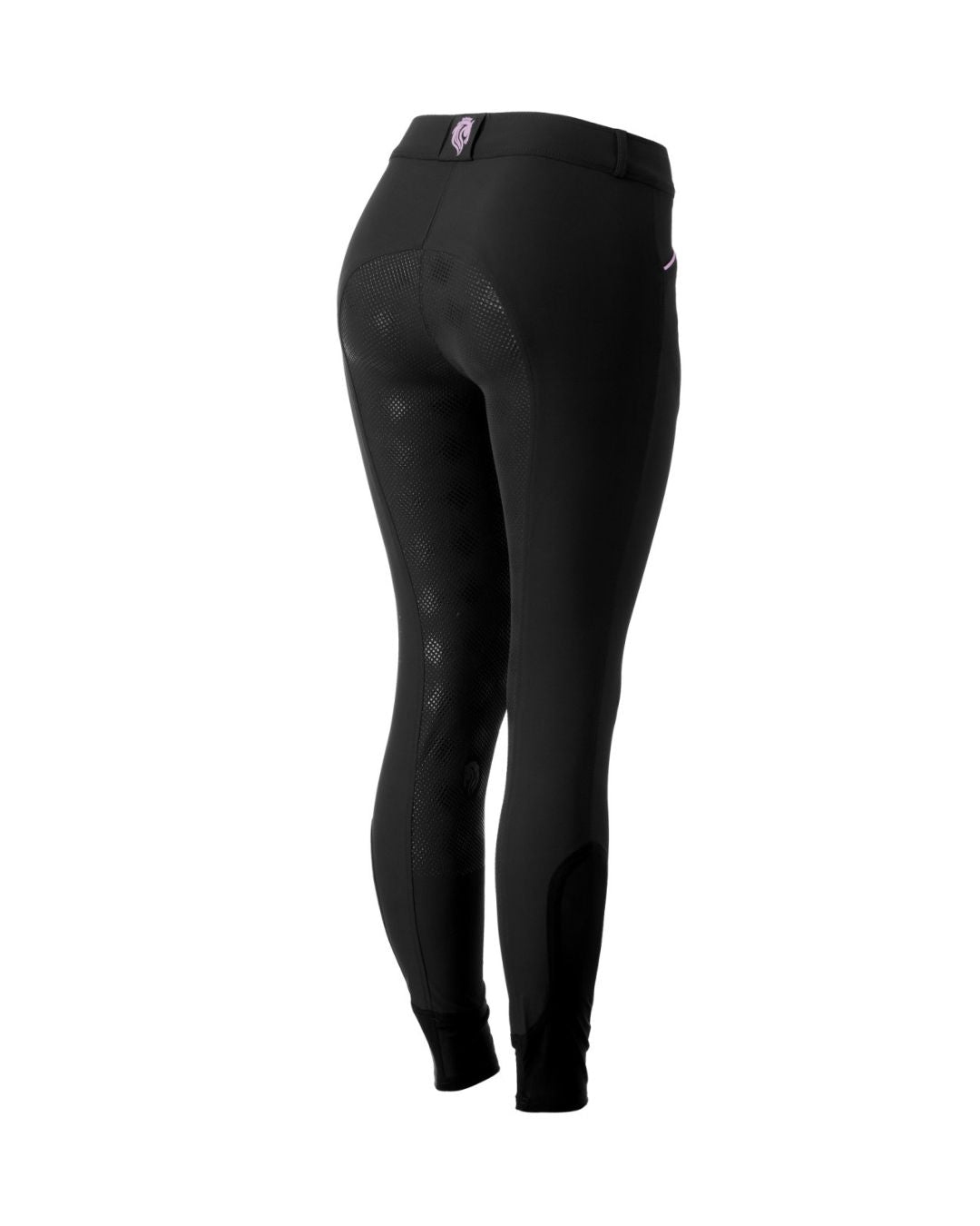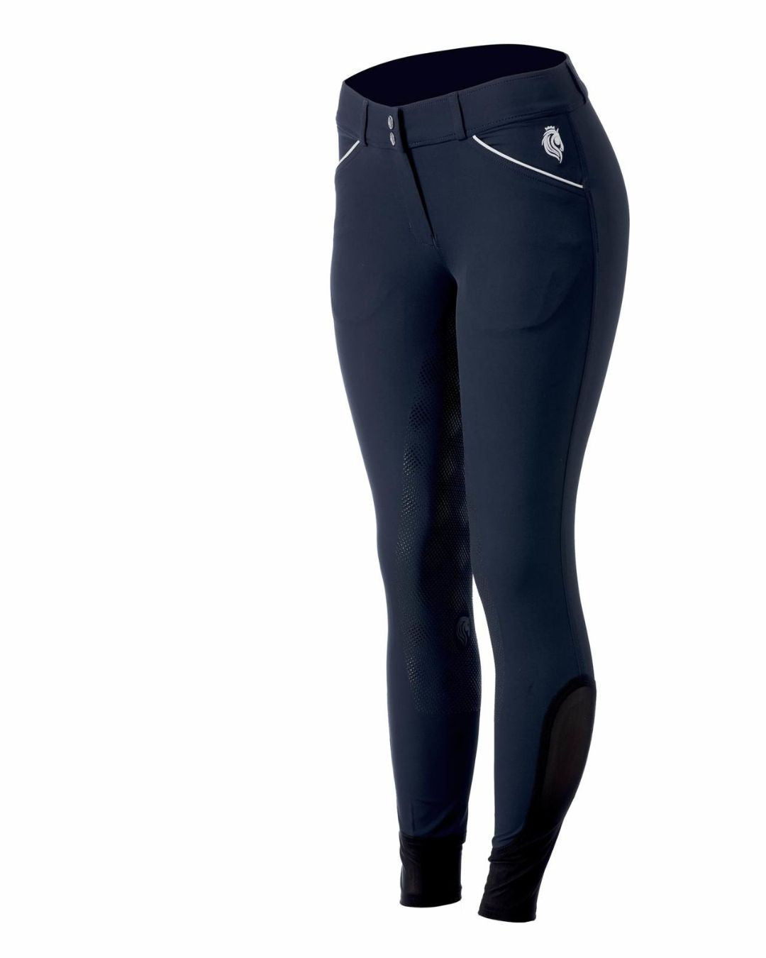 - Mid rise fit, flattering waistband, slightly higher in the back for in-saddle comfort, and silicone grip inside to keep shirt neatly tucked in