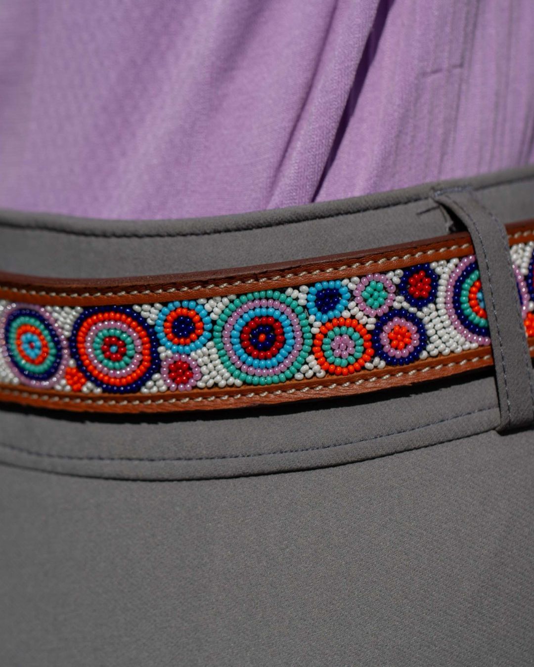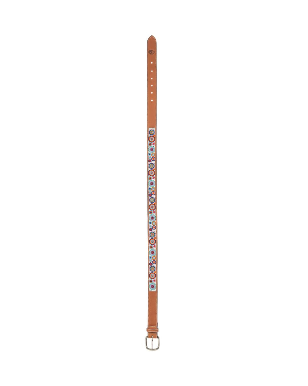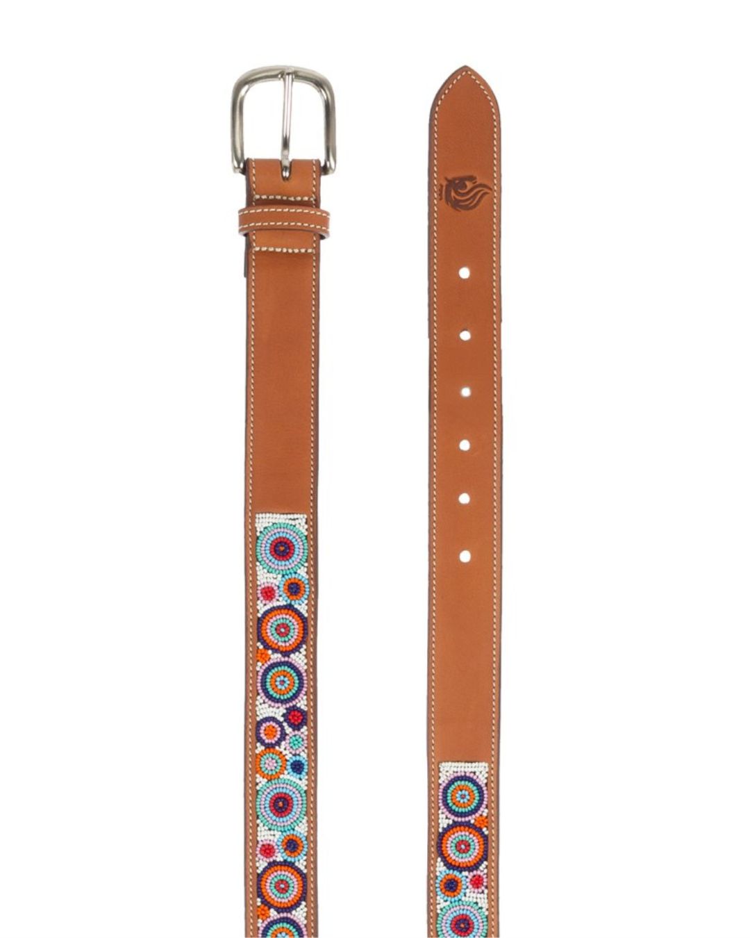 Crafted from genuine full grain leather, in gorgeous chestnut this belt offers a supple feel that requires minimal break-in time. The hand-beaded design in classic circle prints and colors adds a touch of sophistication, elevating any outfit. With its durable leather and intricate detailing, this belt is both stylish and functional.