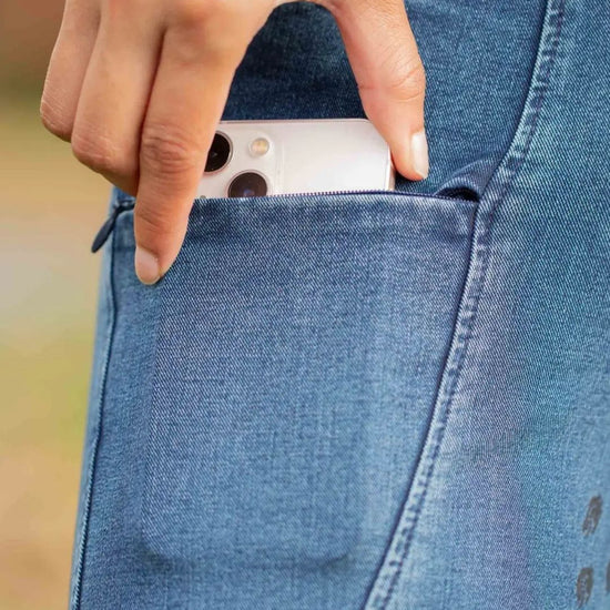 Classic 5-pocket styling is modernized with extra-deep front scoop pockets and two discreet zippered thigh compartments—both large enough to hold a smartphone. A silicone full seat ensures grip without bulk, while the mesh sock bottoms reduce pressure under tall boots. Finished with YKK zipper hardware and subtle, bridle-inspired back pocket stitching, these breeches strike the perfect balance between function and equestrian fashion.