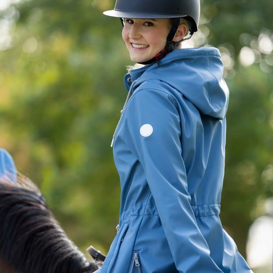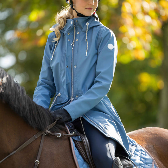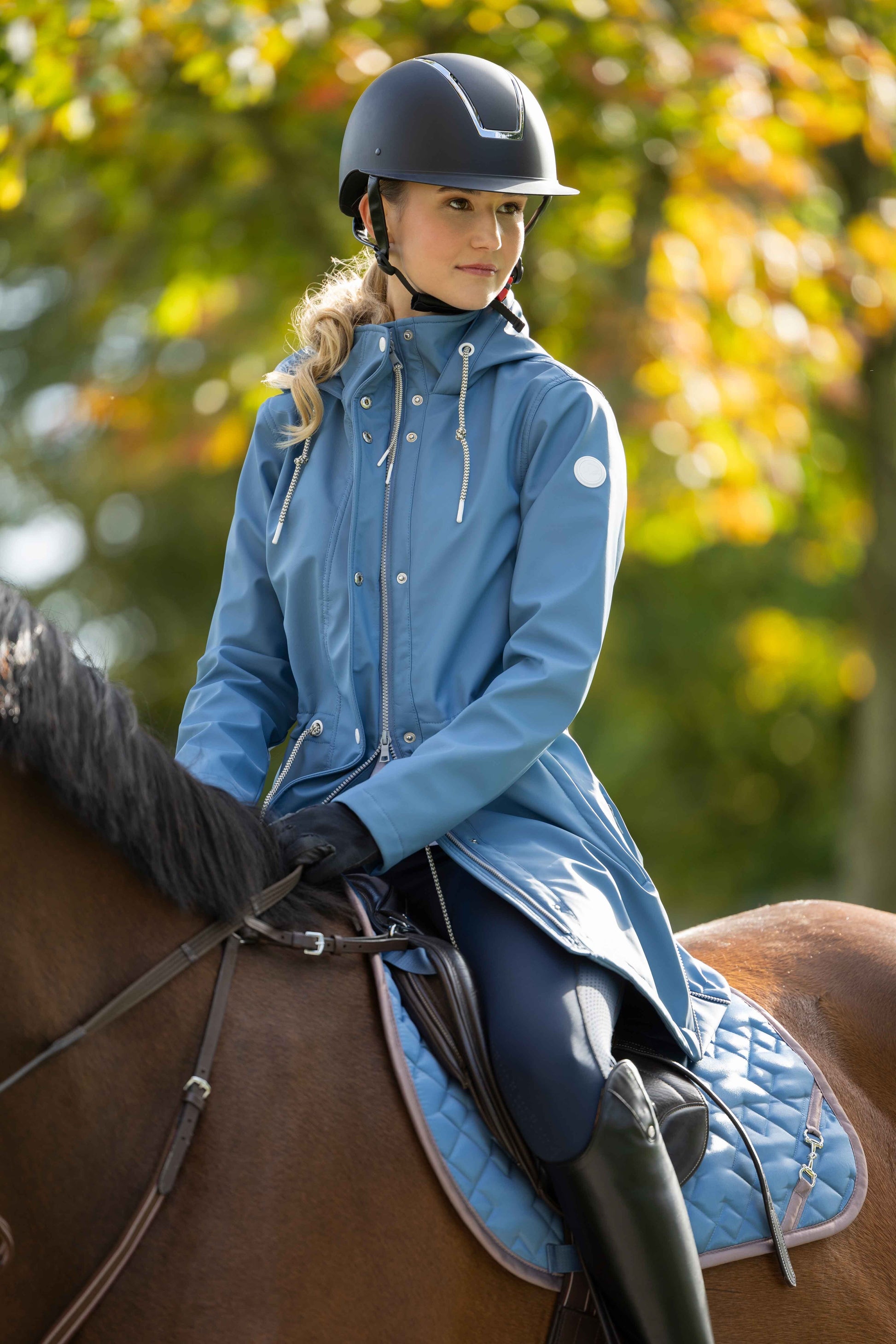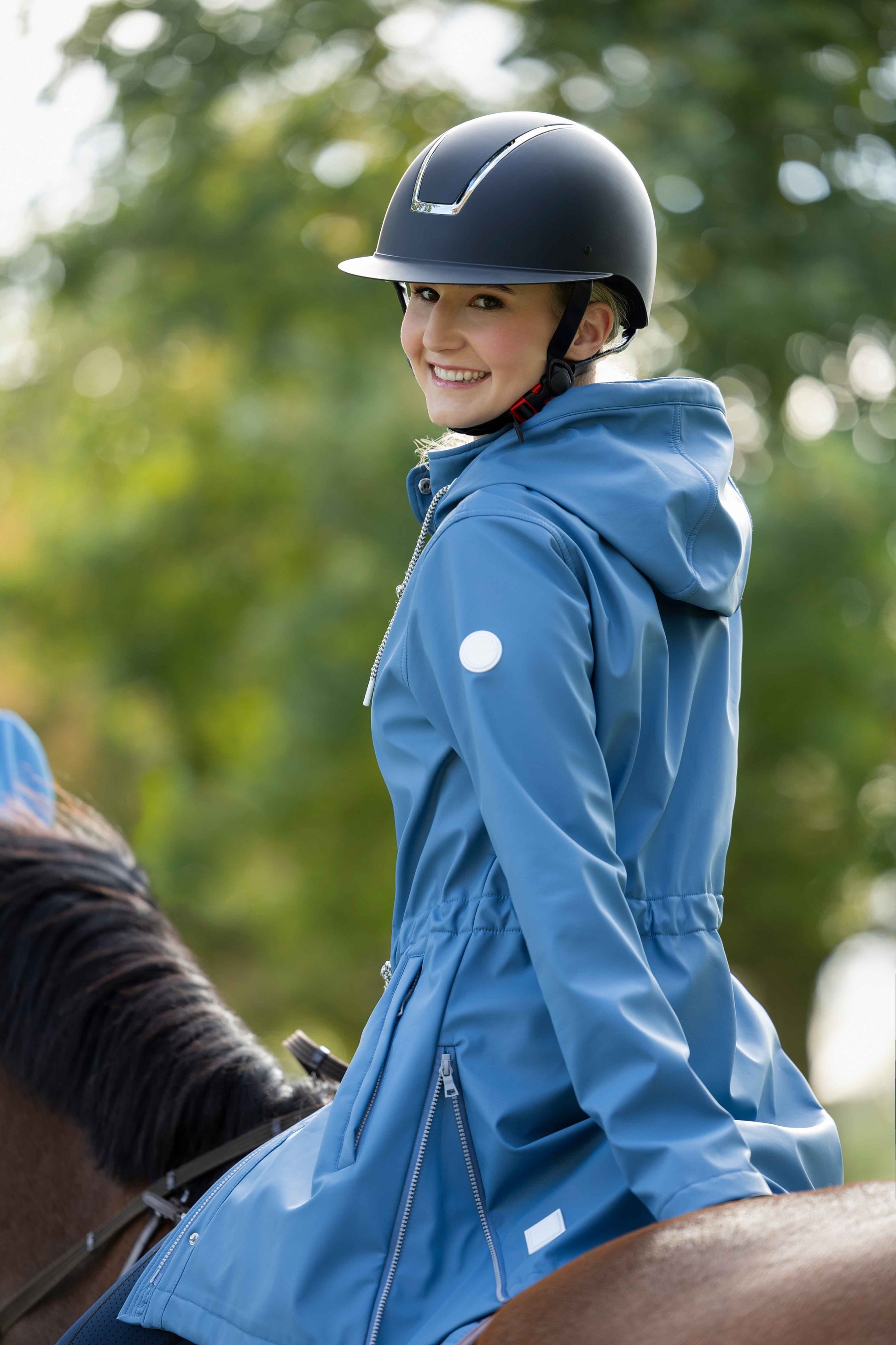 This riding jacket offers optimum protection in all weather. It is waterproof, breathable, windproof and dirt-repellent, so you are perfectly equipped for rain, wind and cold. The jacket will keep you comfortable thanks to the soft fleece lining. The two-way zip with placket and water-repellent zip pockets provide additional comfort and functionality. Practical details such as the individually adjustable waist, the adjustable hood and the side riding slits with zip make this jacket the perfect companion for the stable and everyday life.