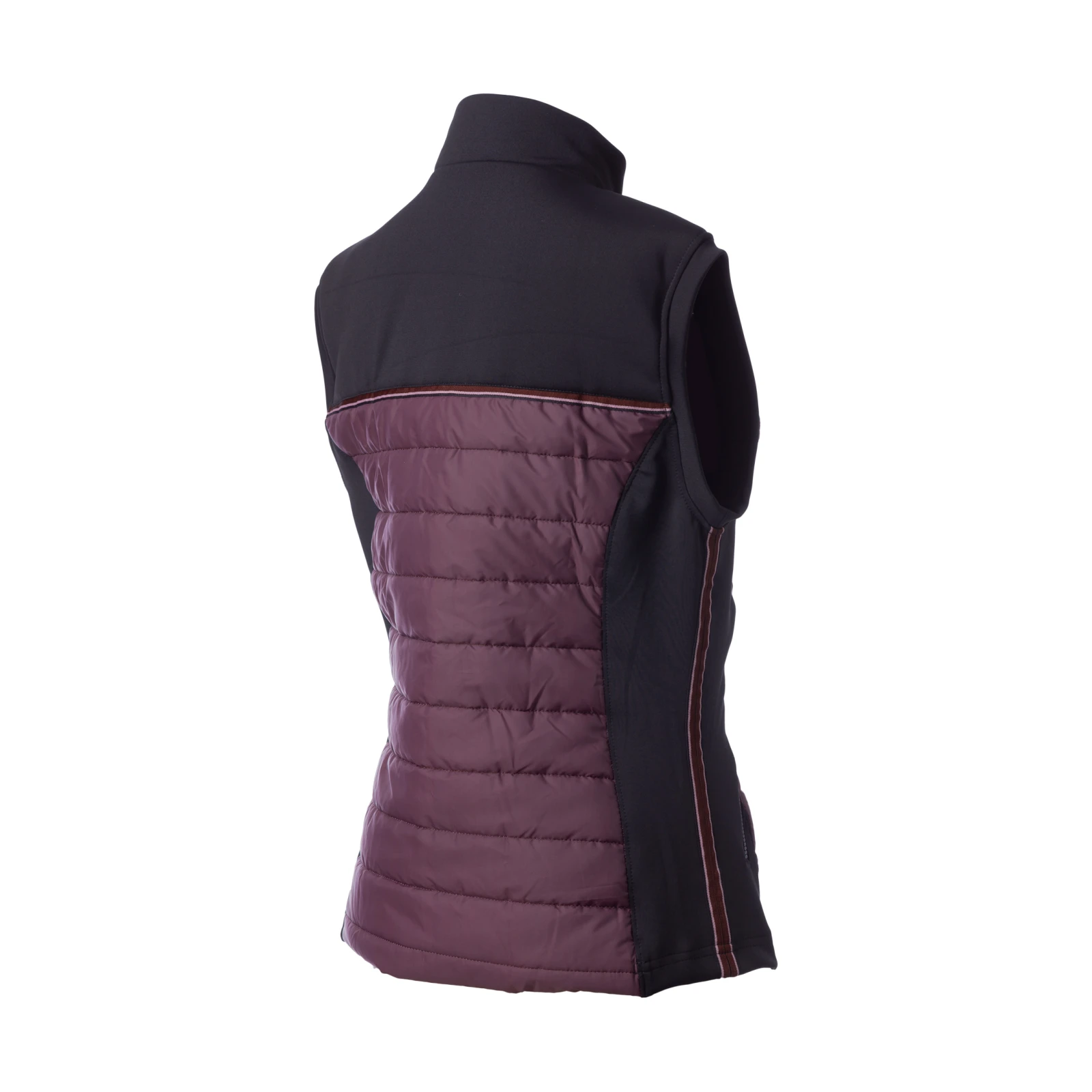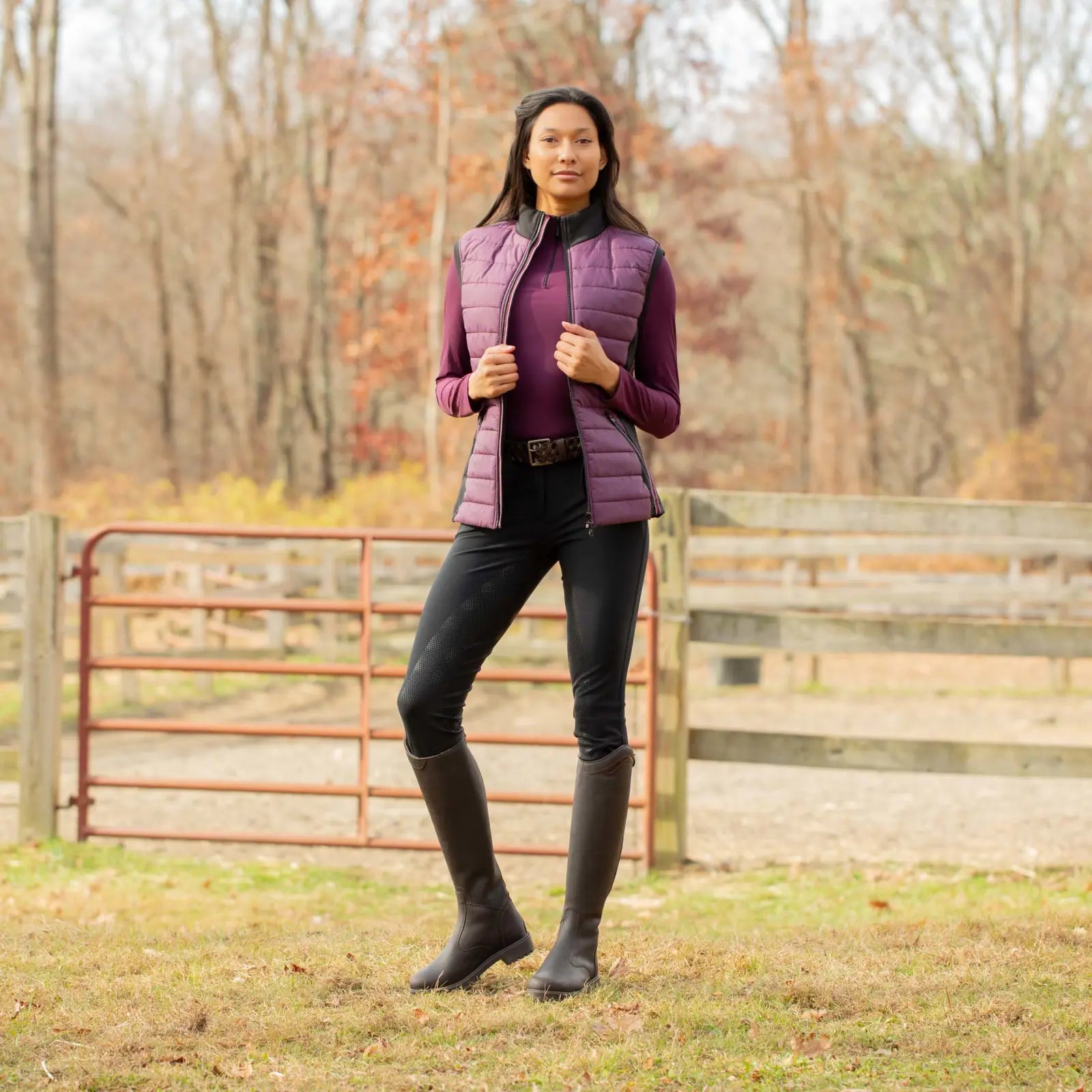 The Equinavia Heidi Women’s Insulated Riding Vest features 120g of poly fill insulation in the channel-quilted front and lower back which effectively traps heat at the core. Stretch nylon side panels offer enhanced flexibility and a contoured fit, making it ideal for layering during cold-weather rides. The double-layer stand-up collar and elasticized armholes help block wind, while durable YKK zippers on the front and pockets ensure longevity. A tonal ribbon detail adds refinement, and the solid upper back panel allows for custom barn or team embroidery.