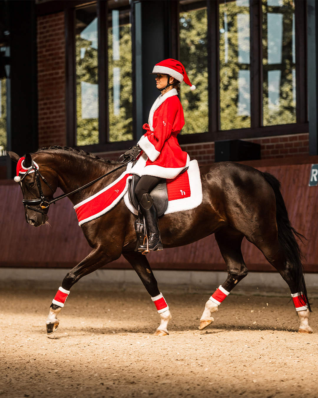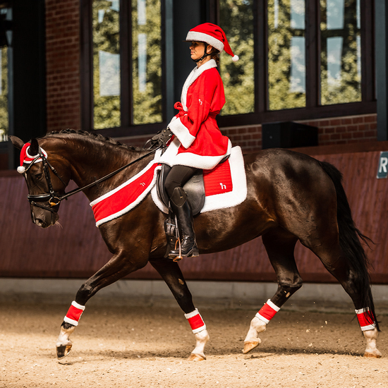 Get into the holiday spirit with the Horze Santa Helmet Cap. This red and white poly cover is designed to transform your helmet into a Santa-style cap, perfect for spreading seasonal cheer. Made with soft material, this cap adds a festive touch to your riding ensemble. Ride in style this Christmas with the Horze Santa Helmet Cap.