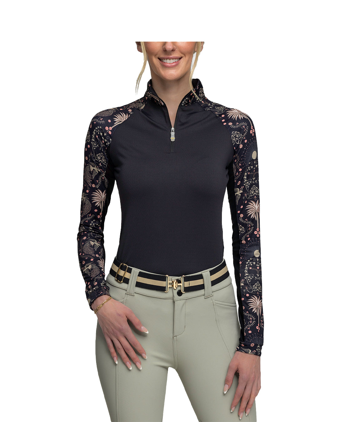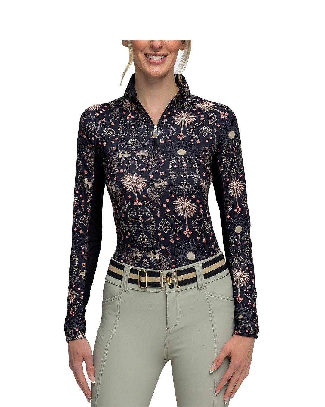 Introducing the Kastel Black Regal Palm Long Sleeve Top, a luxurious and functional addition to your wardrobe. Stay cool and protected with UPF 30+ technology while making a stylish statement with the signature 1/4 zip design. Perfect for active days in the sun.