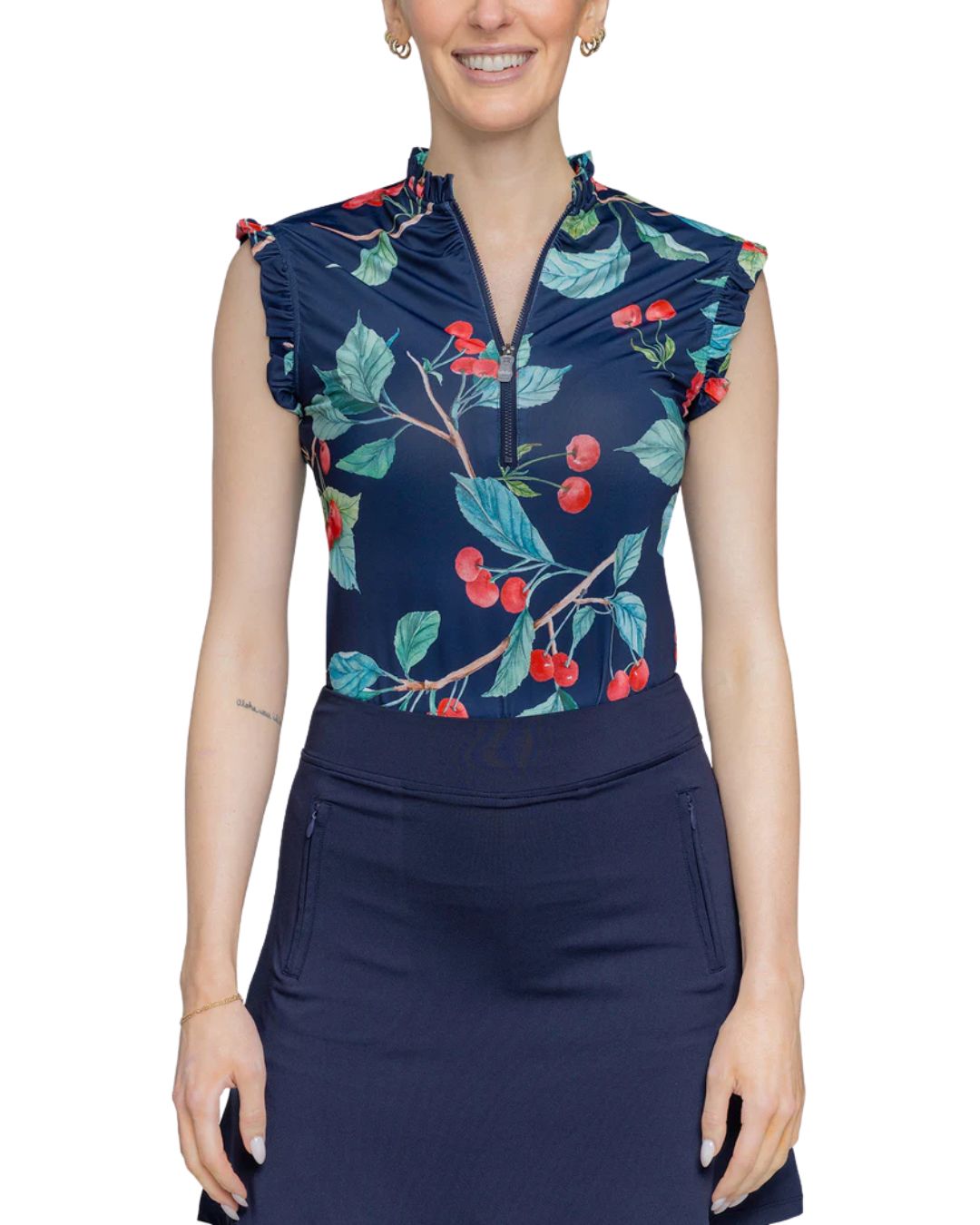 Kastel Navy Cherries 1/4 Zip Ruffle Tank Top