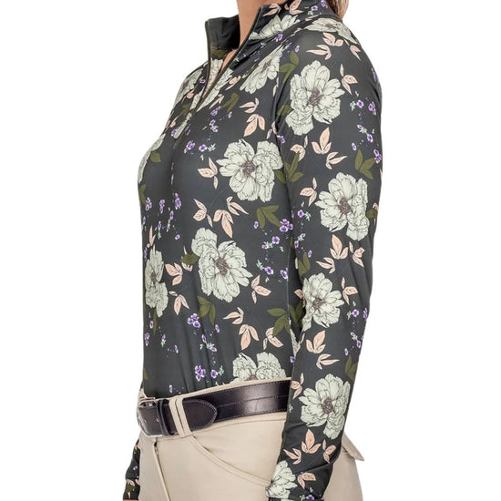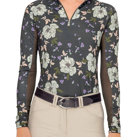 Our contemporary garden rose print in rich slate grey, soft crème, blush and olive green is the perfect pick me up this season. UPF 30, 1/4 zip neckline, breathable power mesh, soft 4-way stretch, flattering worn tucked in or left out.