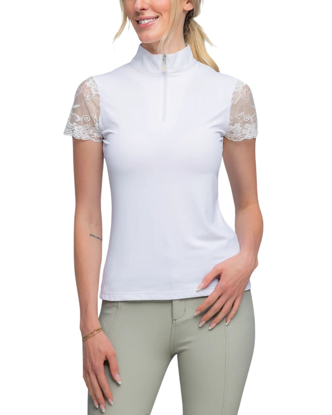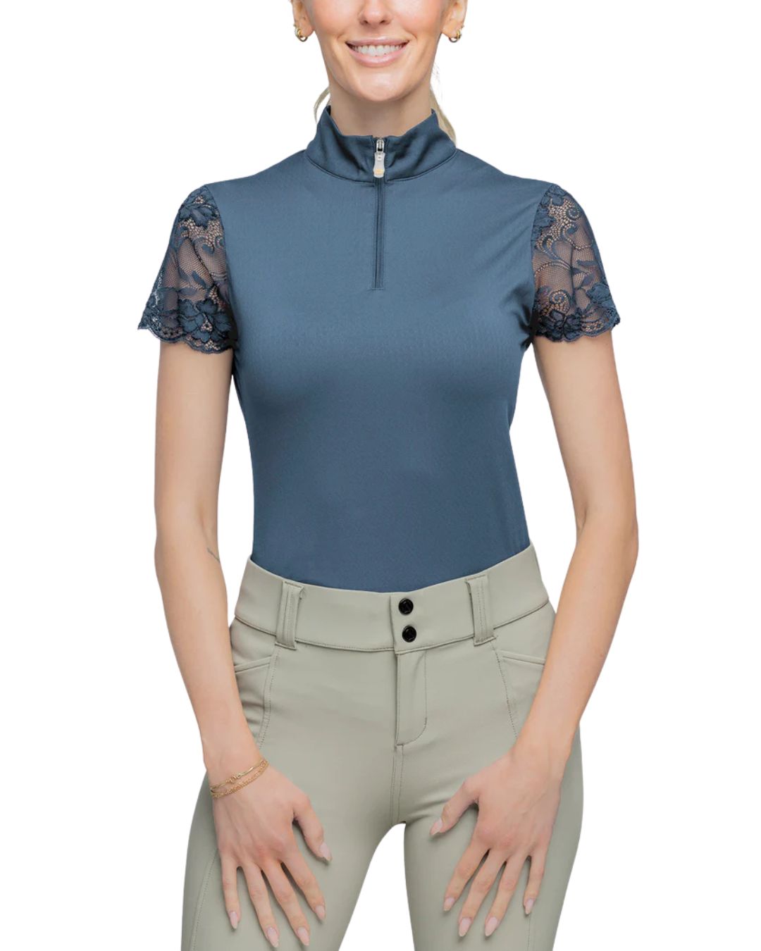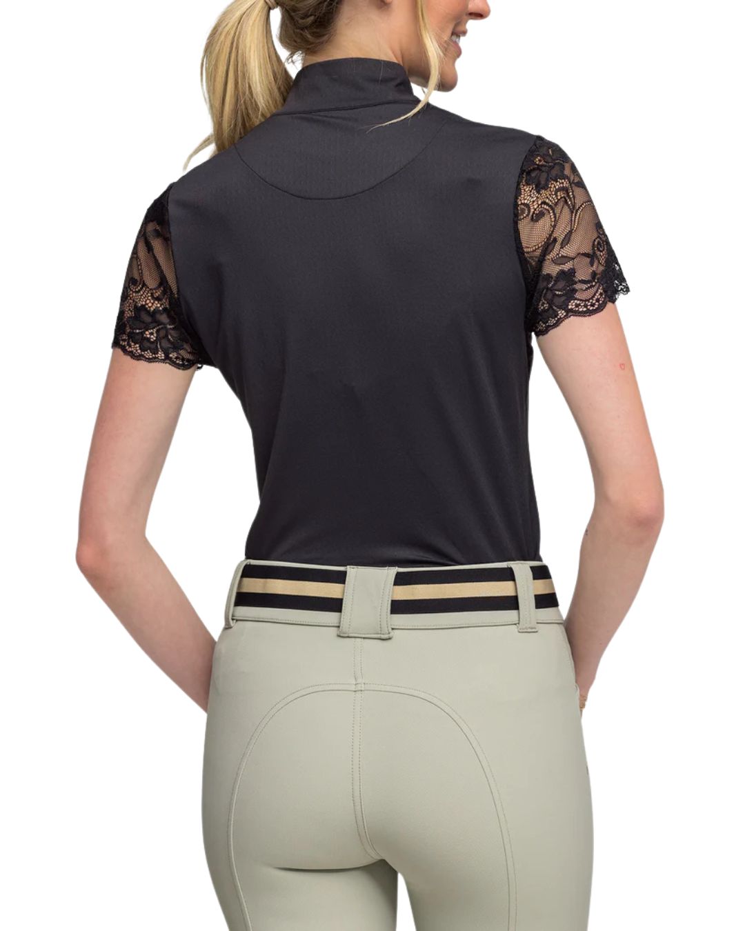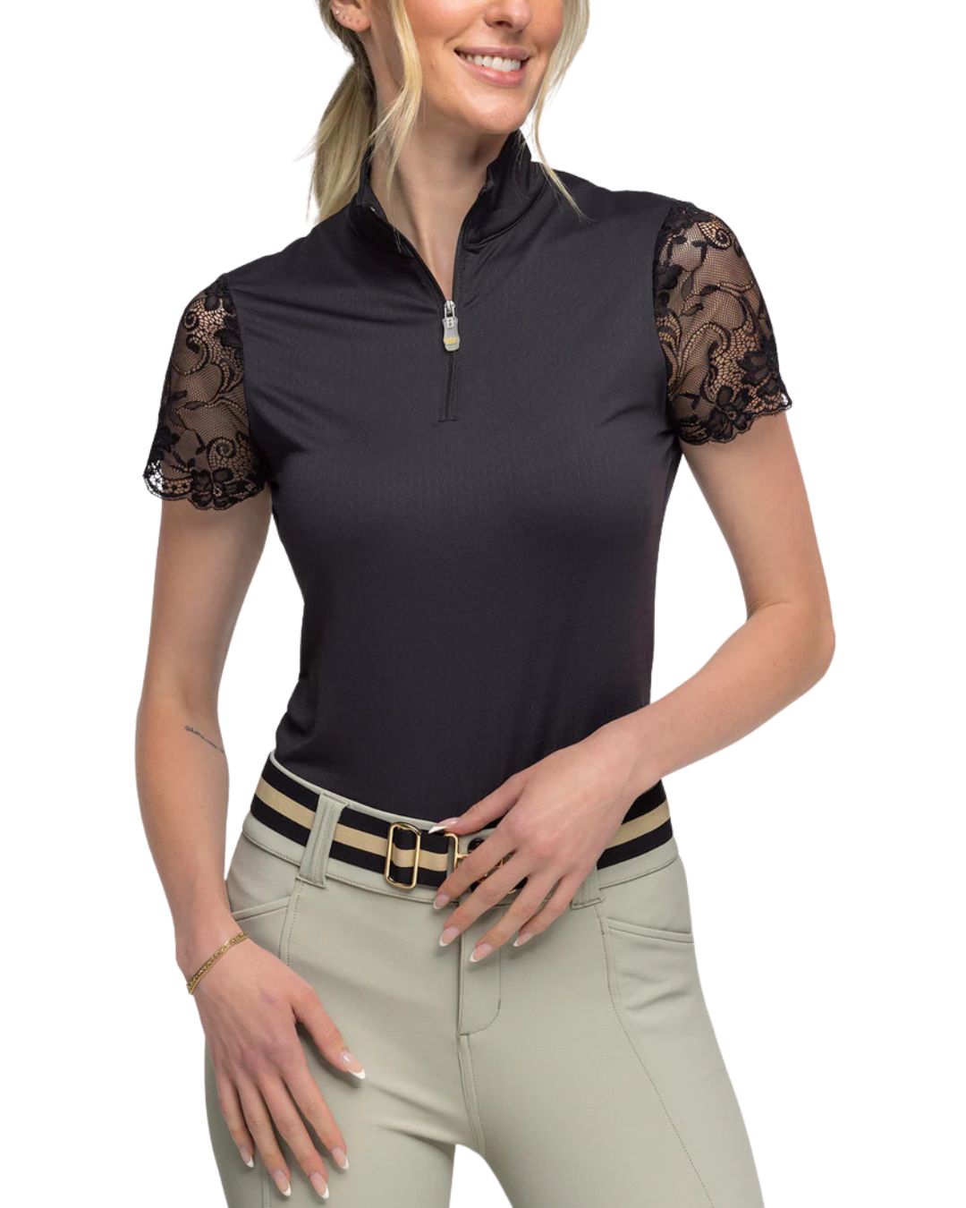 Our super soft, stretchy, feminine lace galloon cap sleeve ¼ zip in sleek, classic back will be your next favorite. On the course, in the ring this lifestyle piece is a must have.