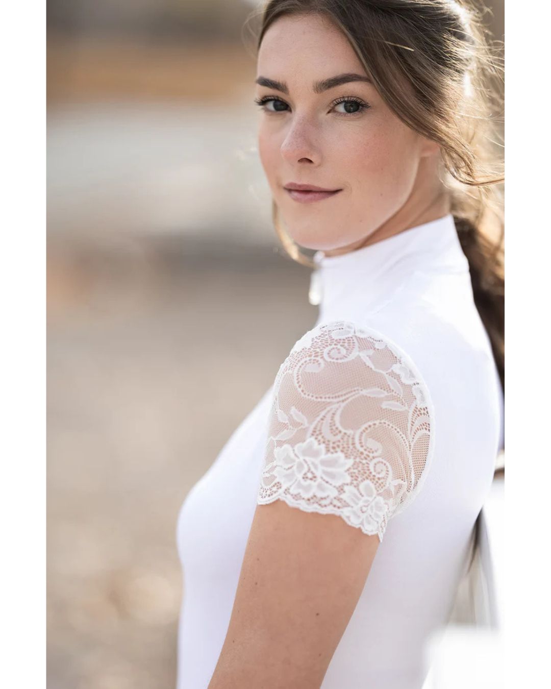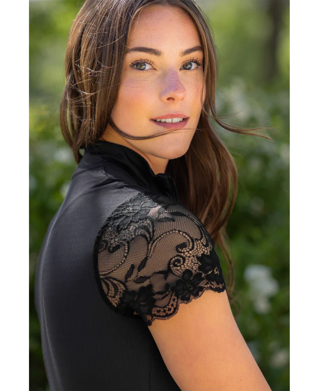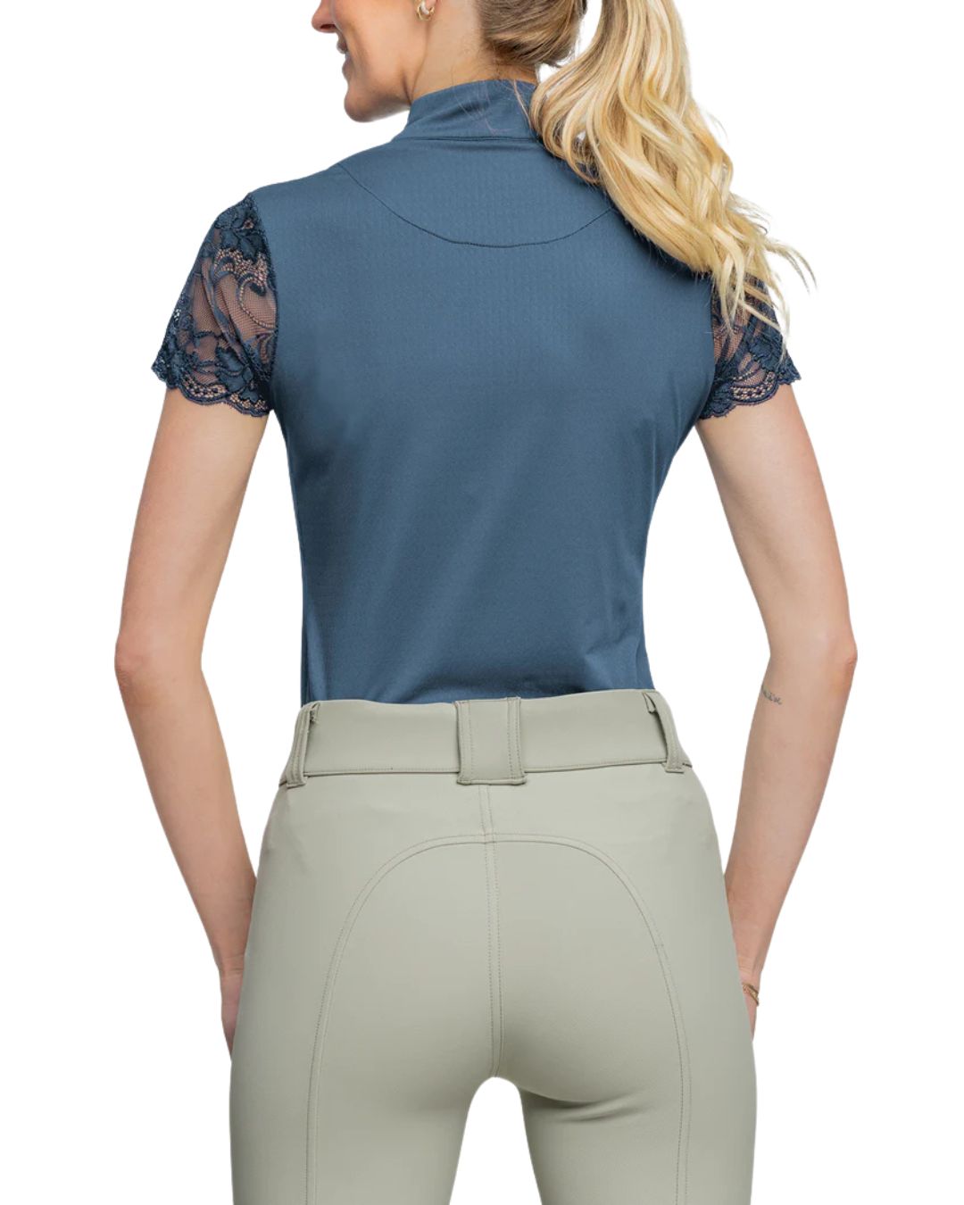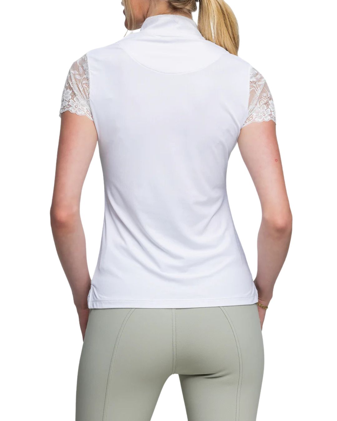 Our super soft, stretchy, feminine lace galloon cap sleeve ¼ zip in sleek, classic back will be your next favorite. On the course, in the ring this lifestyle piece is a must have.