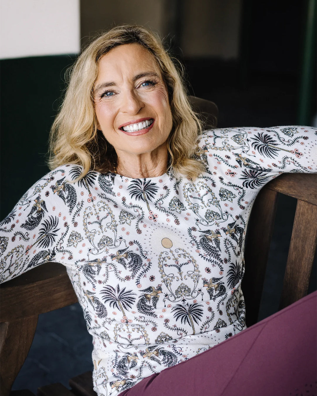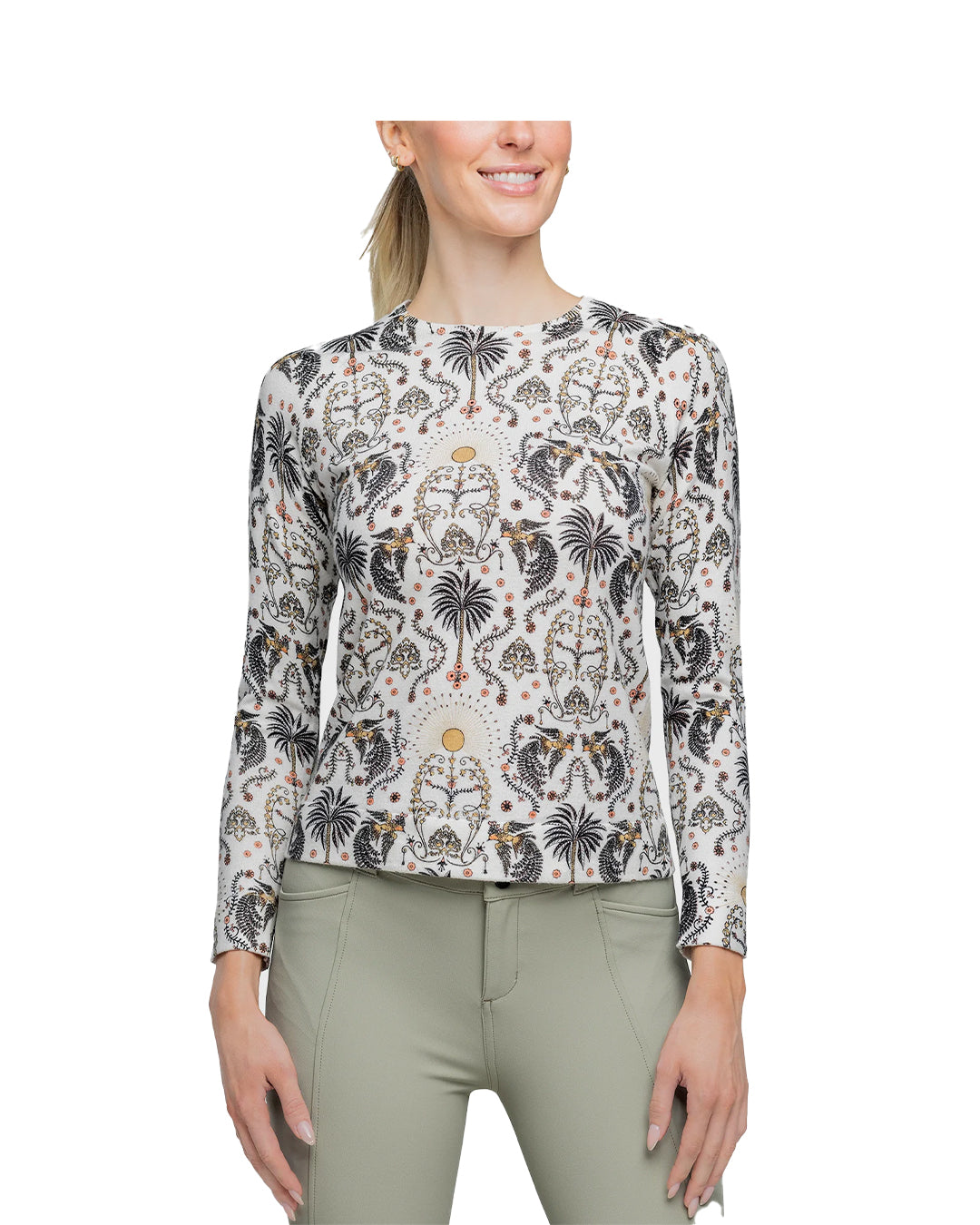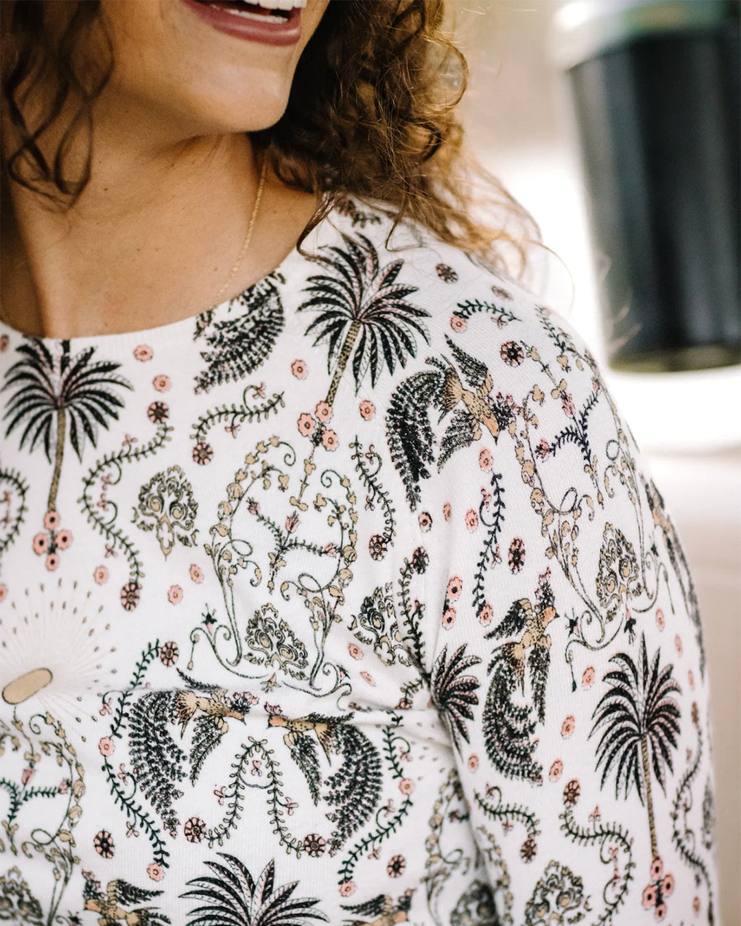 Our super soft Regal Palm Art Deco print sweater is divine. This cozy long sleeve crewneck will go with everything in your active wardrobe. With a pattern of cream, soft coral and desert sand colors