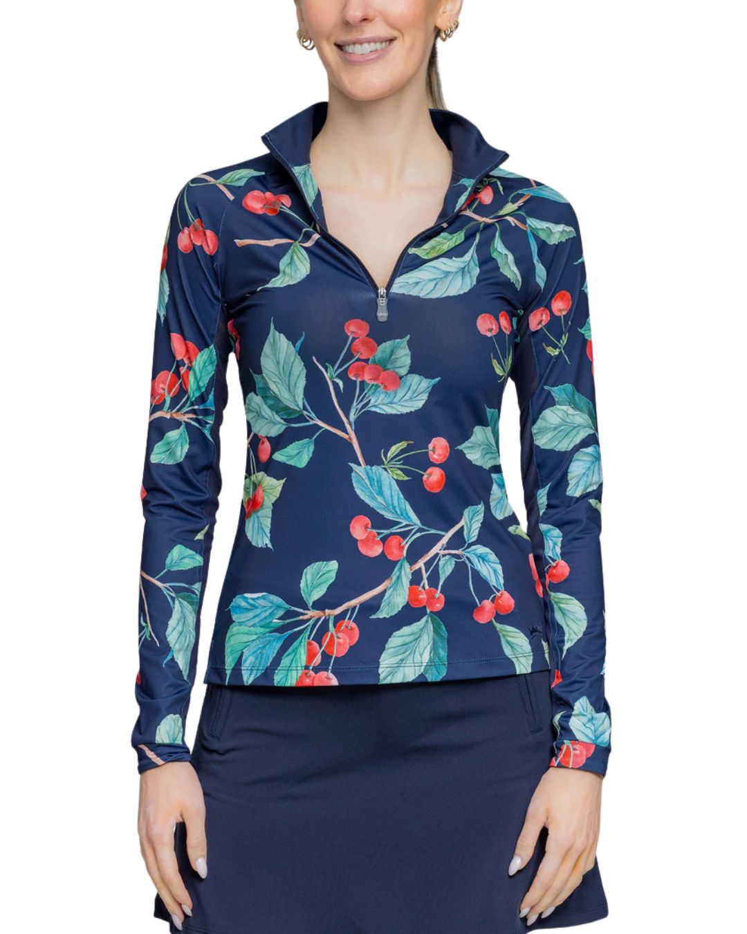 Rich navy pairs with whimsical cherries this season. Perfect for the course, the court and all your day-to-day active pursuits. Long sleeves, ¼ zip, UPF 30, breathable power mesh and soft 4-way stretch fabric in a contemporary fit