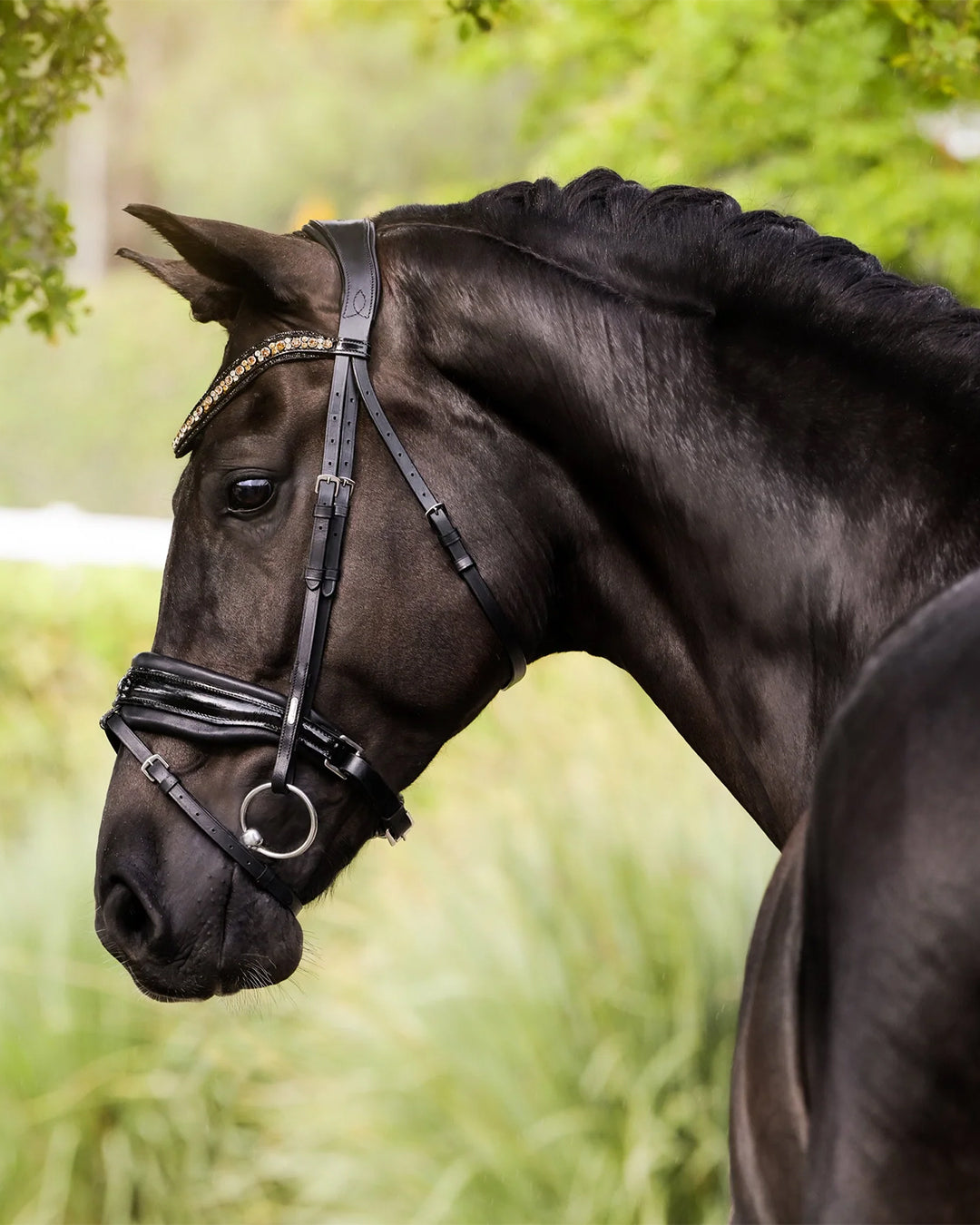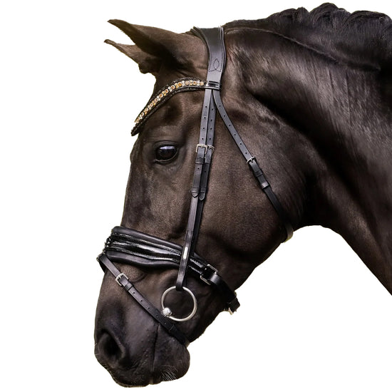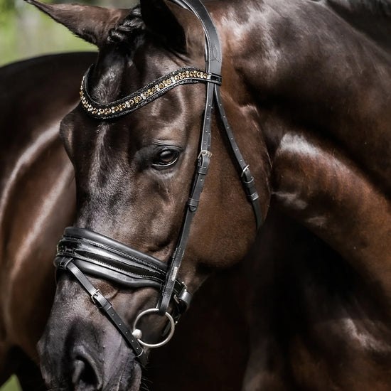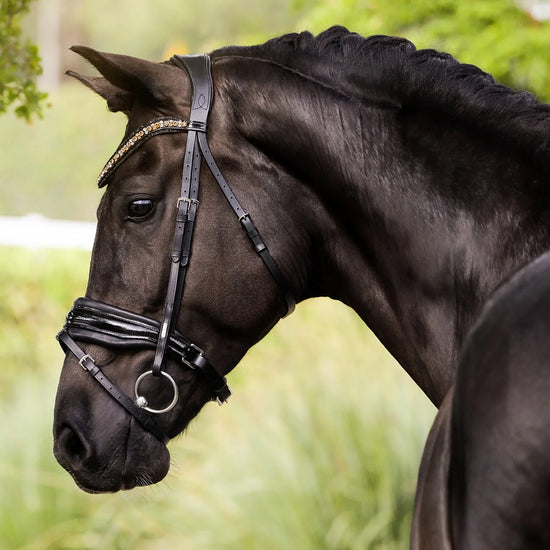 Handcrafted from butter soft, premium leather, the Ariana pairs beauty with comfort. The monocrown headpiece is gel padded, molding comfortably to the poll. Shaped with space for the ears and clearance for the sensitive nerves over the horse's poll, the headpiece has been designed with comfort at the forefront.