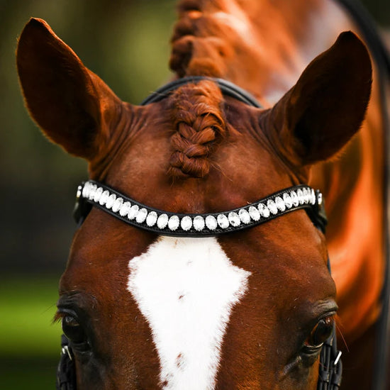 The Diva features a browband of Austrian Stellux crystals, set into an elegantly curved leather band. The browband features an easy change system, concealed by a silver satin button.