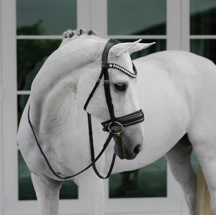 For those who aren't afraid to shine, we introduce the 'Diva'. This unique and original snaffle bridle bedazzles; a curved browband of oblong crystals is paired with a noseband accentuated with silver piping.