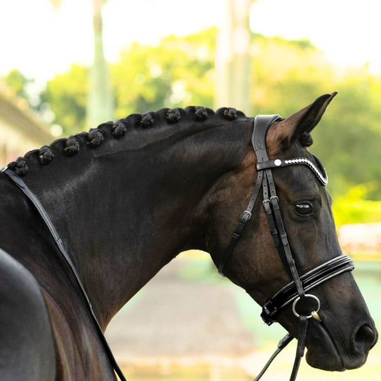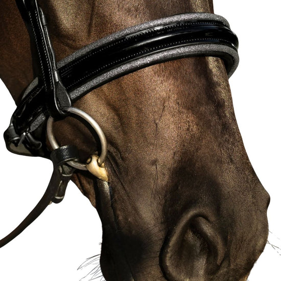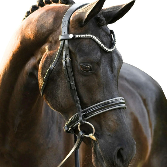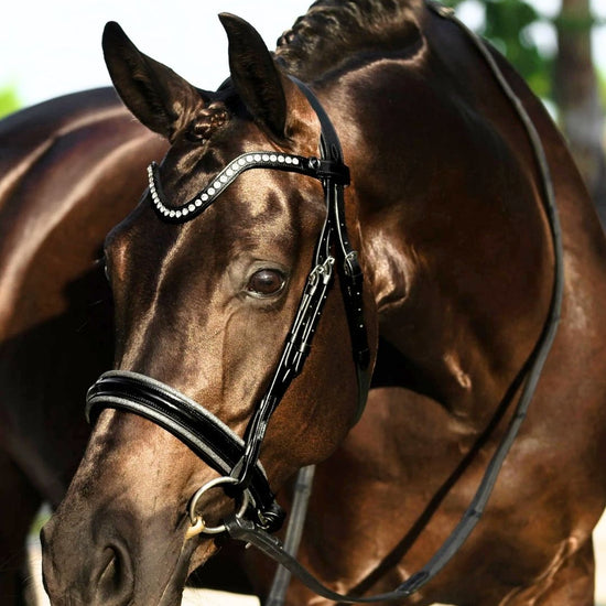 The ‘Saphira’ snaffle is a dressage bridle at its finest with dark silver piping on a glossy patent noseband. This bridle has a standout elegant ‘v’ shaped clear crystal browband, handcrafted from Austrian stellux crystals.