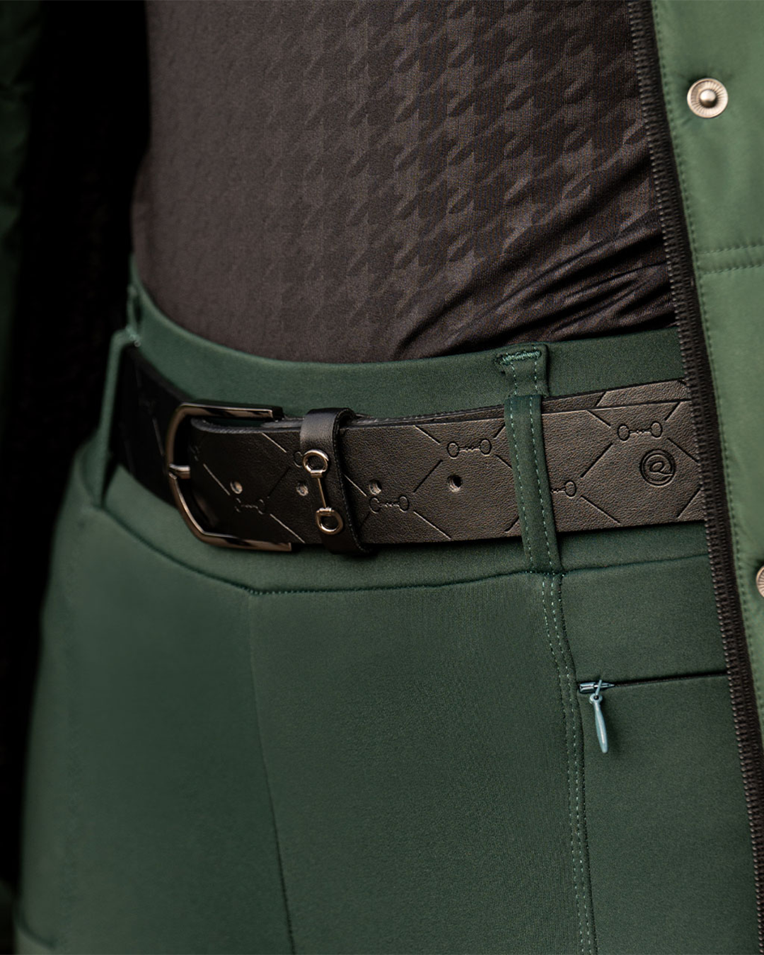 Elevate your equestrian style with the QHP Jadie Belt. Made from luxurious leather, this belt features an engraved bit pattern and a statement black buckle. Perfectly paired with the winter collection's breeches, it's a must-have for any discerning rider.