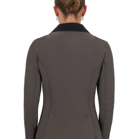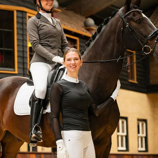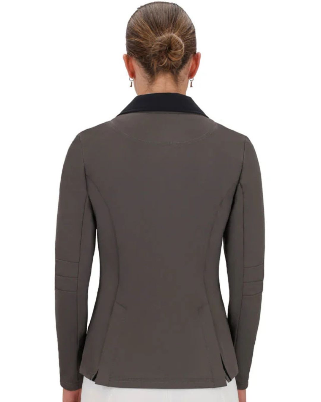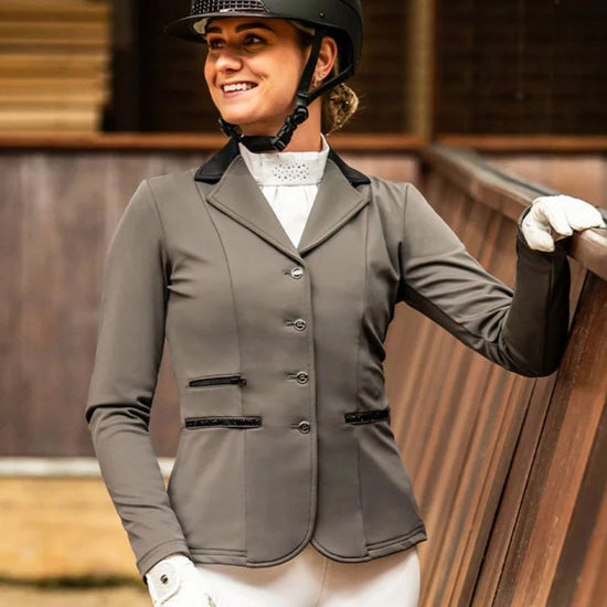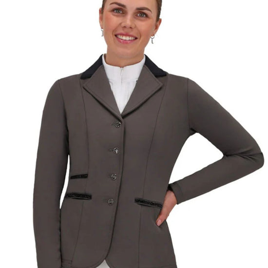 Shine during your competition with this chic competition jacket. The jacket has a concealed zipper behind the button closure so that the buttons won't pull. The stretchy, breathable fabric ensures a comfortable ride and is also water-repellent. The glitter tape on the zip pockets and black faux zip pocket complete the jacket.