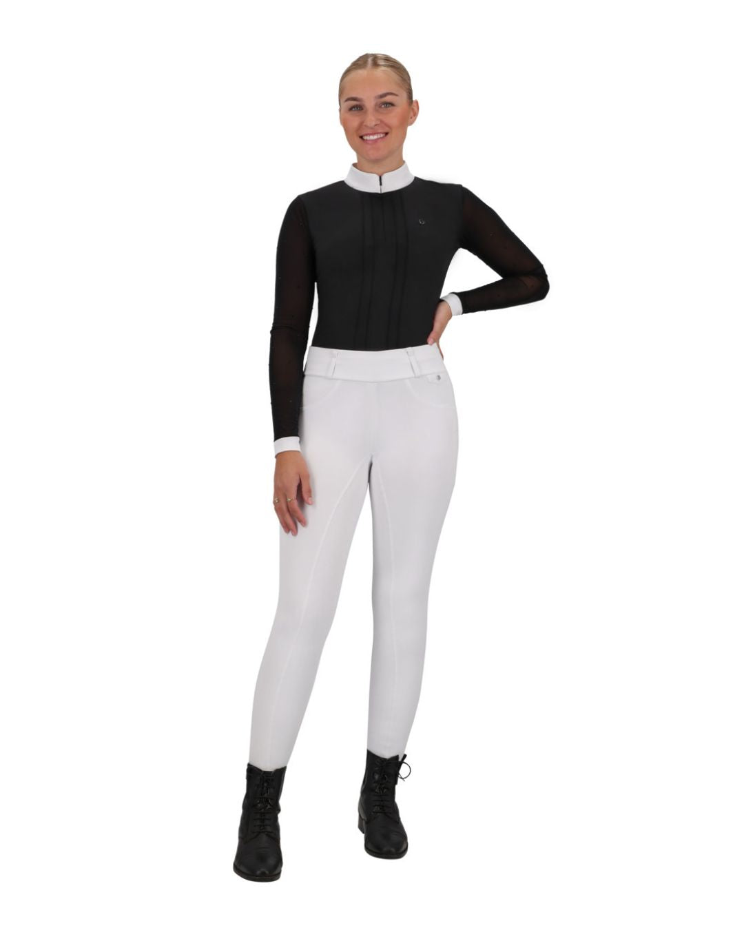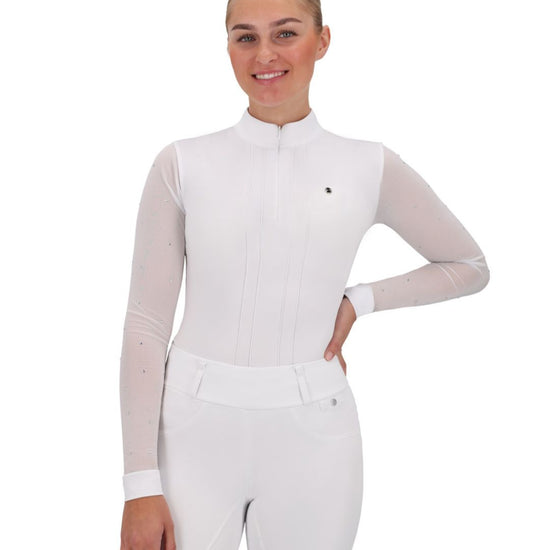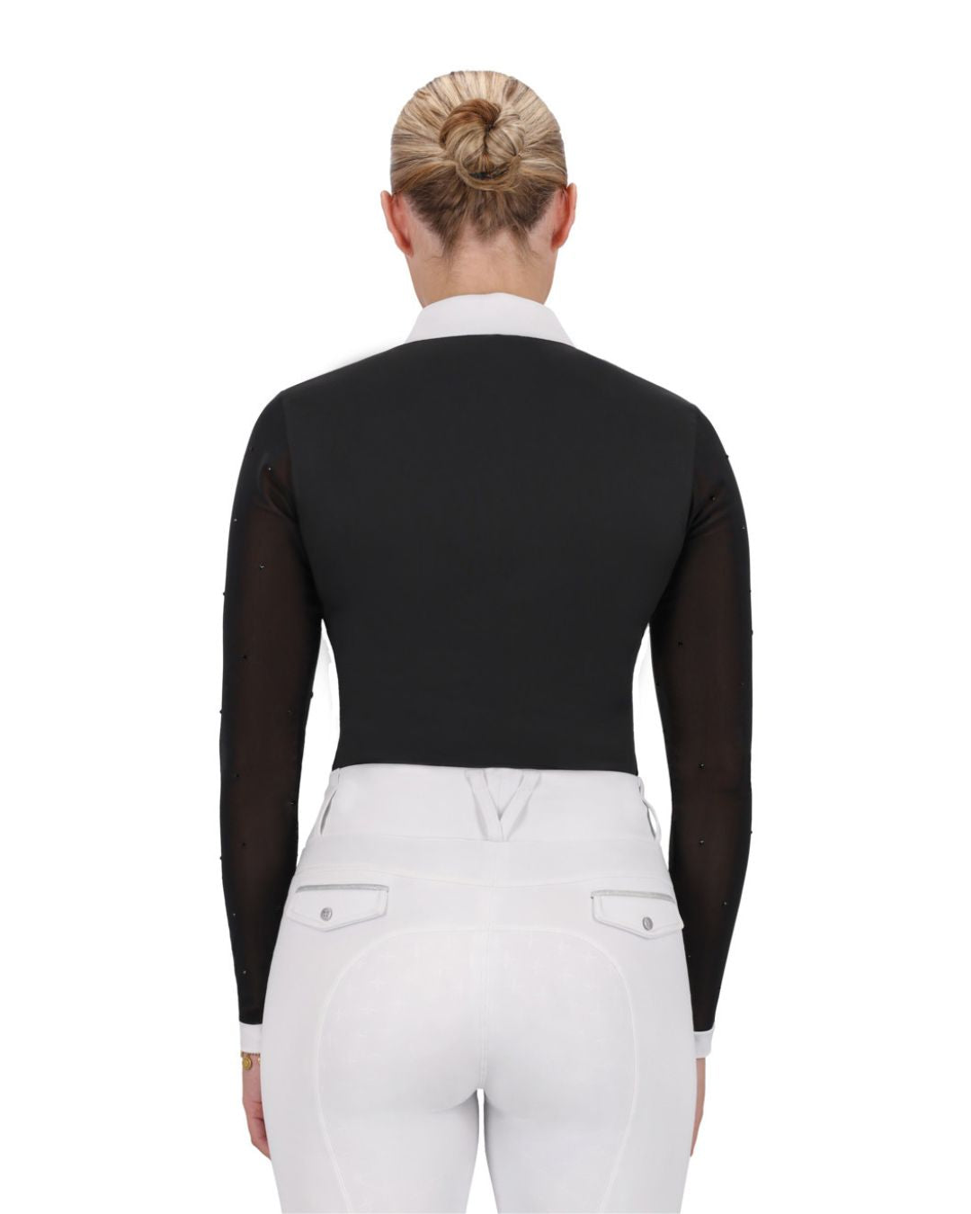 The Sennah long-sleeve show shirt from the QHP winter collection combines elegance with comfort. Crafted from stretch fabric for an exceptional fit, it features delicate mesh sleeves adorned with sparkling rhinestones. A discreet hidden zipper and a signature Q-pin on the left chest complete the sophisticated look.