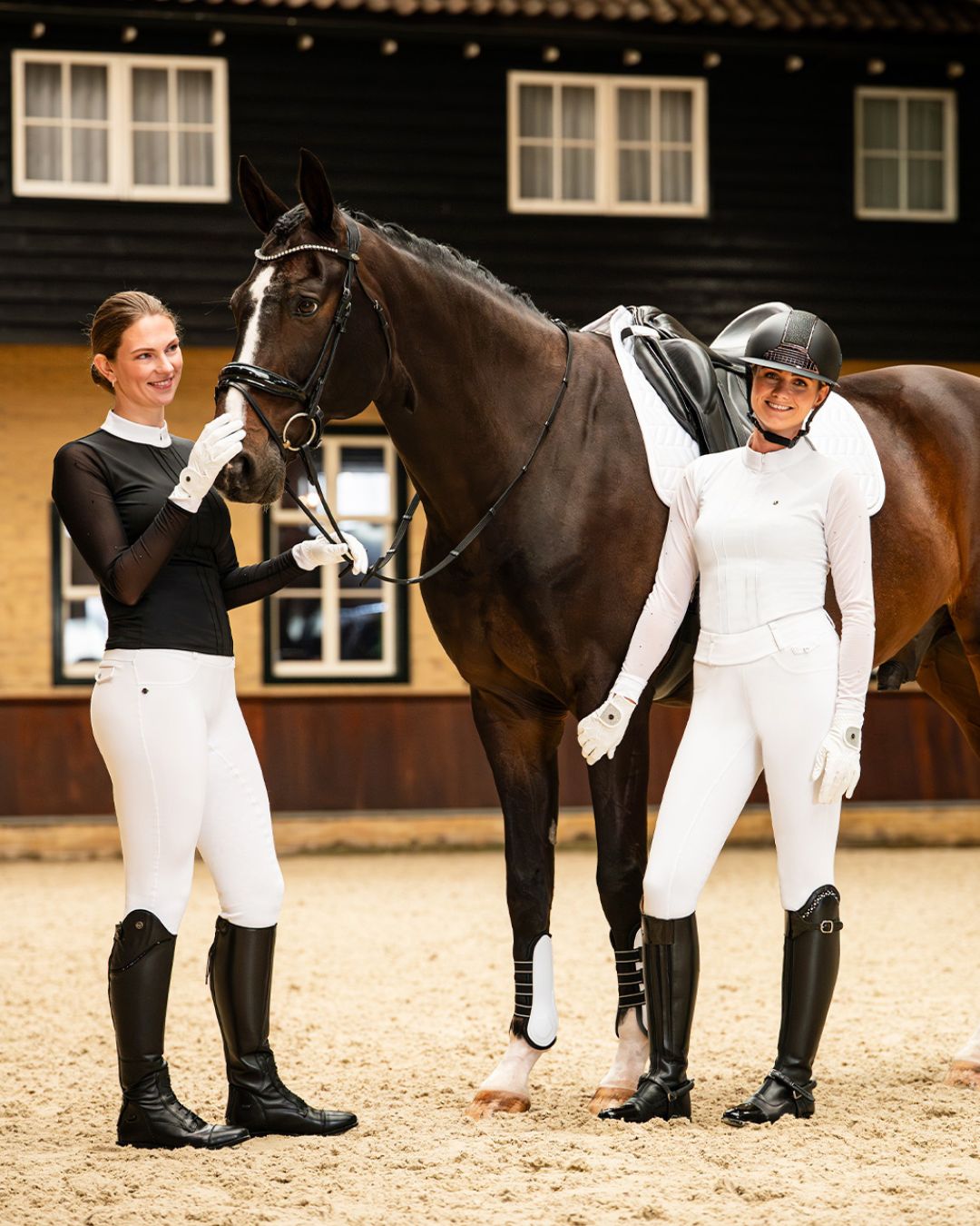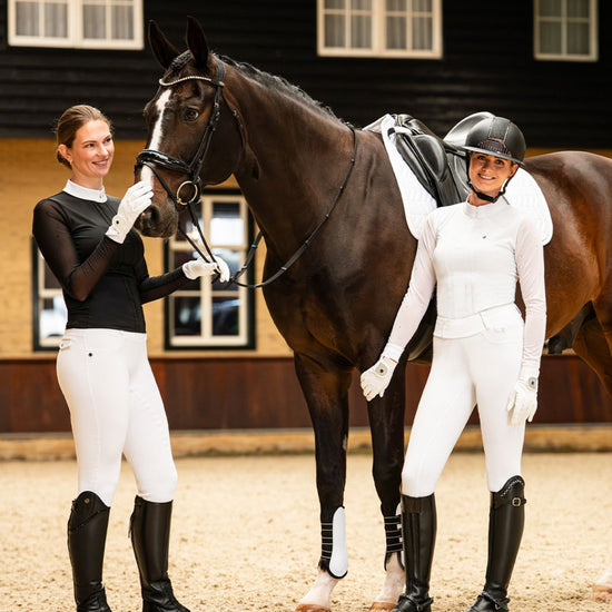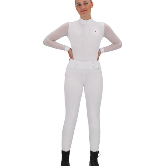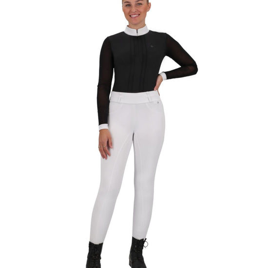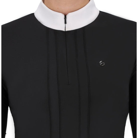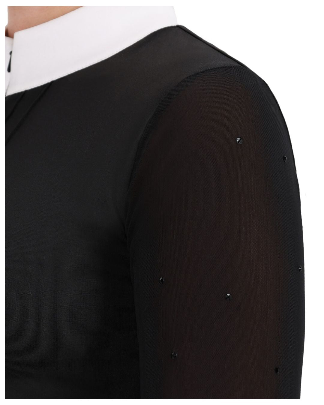 The Sennah long-sleeve show shirt from the QHP winter collection combines elegance with comfort. Crafted from stretch fabric for an exceptional fit, it features delicate mesh sleeves adorned with sparkling rhinestones. A discreet hidden zipper and a signature Q-pin on the left chest complete the sophisticated look.