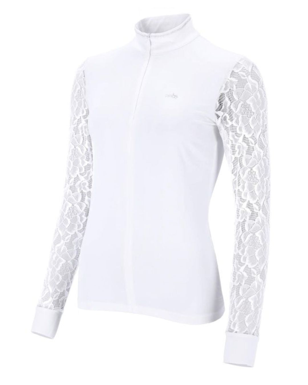This decorative women's competition shirt combines style and functionality for a perfect appearance in the ring. The invisible zipper in the front ensures an elegant design and easy handling. The standing collar with rhinestone embellishment adds a touch of glamour, while the lace sleeves with cuffs provide a feminine and refined look. A rhinestone logo horse on the chest adds a subtle yet stylish highlight.