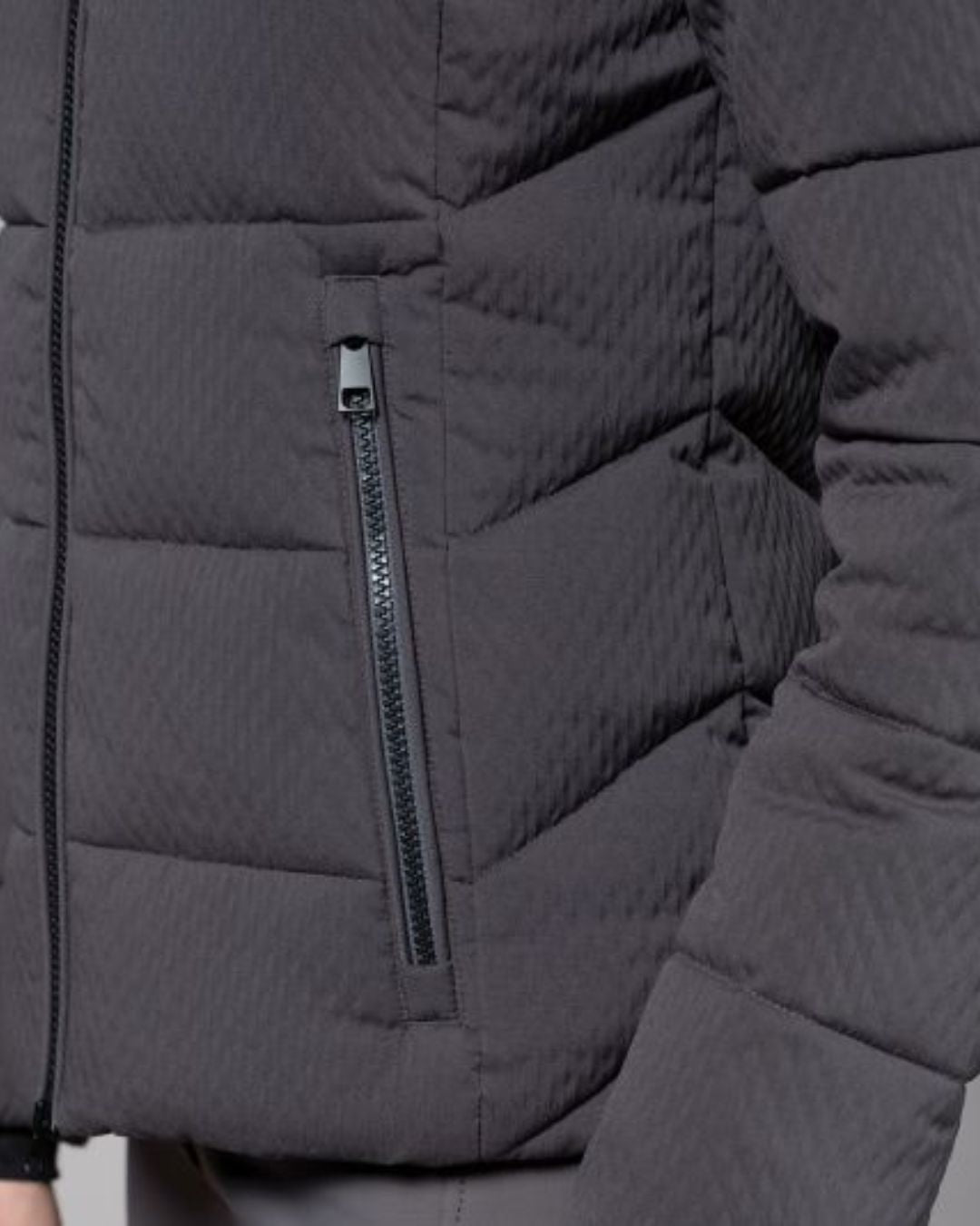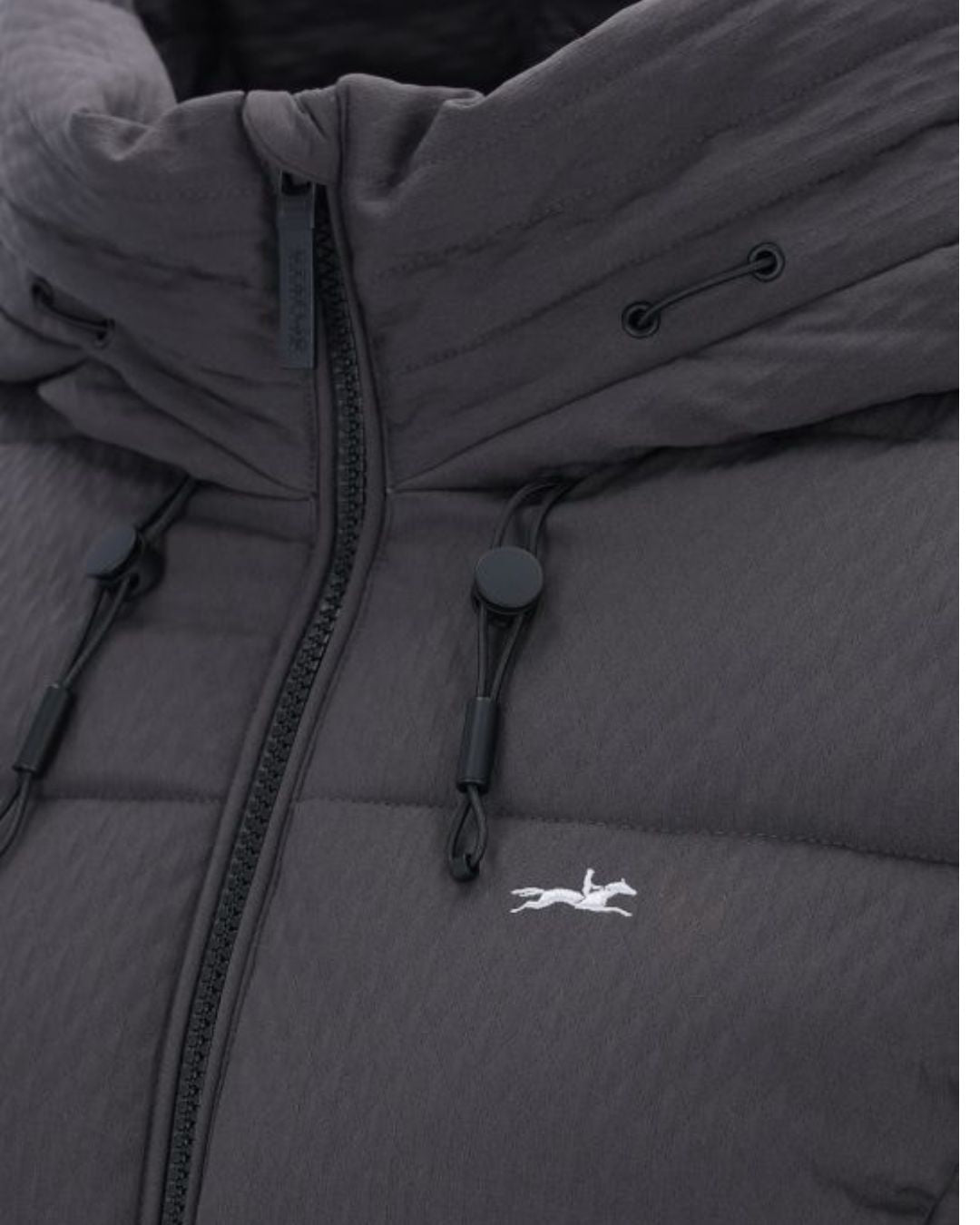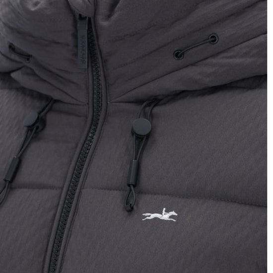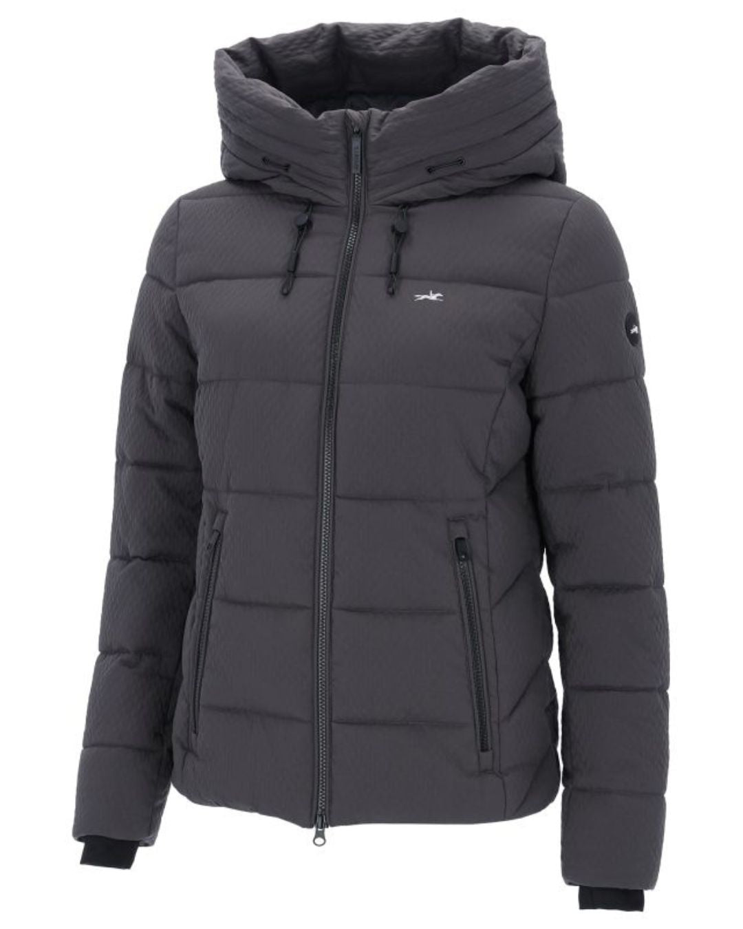 The two-way front zipper allows for optimal freedom of movement while riding, and the zippered side pockets offer secure storage for small essentials. Tonal piping along the front and pockets adds a subtle, sporty-elegant touch. Elastic polyester-elastane cuffs ensure a comfortable fit and effective wind protection. The adjustable hood features a wide trim and can be fastened with a snap button, making it ideal for breezy rides or barn chores. A logo badge on the left sleeve and an elegant embroidered horse motif on the chest complete the design.