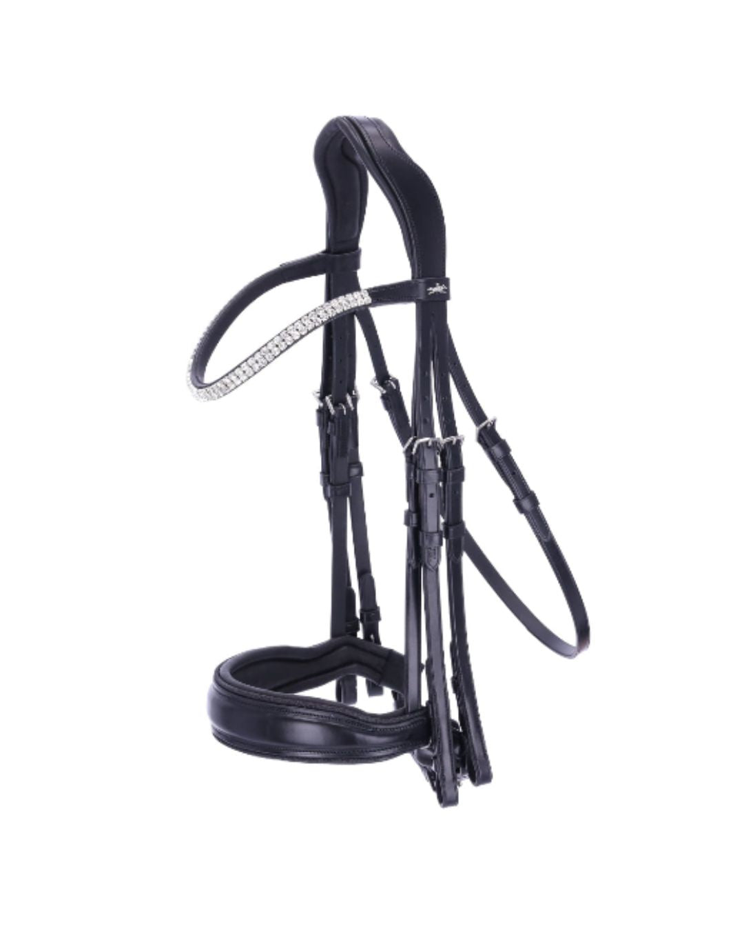 Visually, the bridle stands out with a subtle glitter piping and a slim browband adorned with two rows of square crystals, adding a touch of sophistication. The soft padding and lined D-rings ensure a comfortable fit and gentle contact.